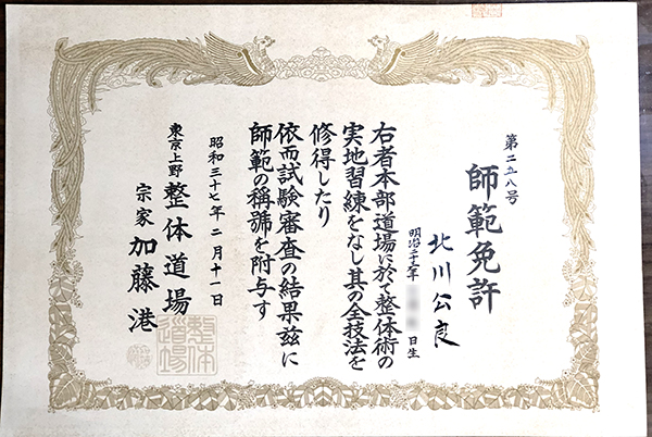 *ご近所の上野桜木で「整体道場」を開かれていた「故:加藤 港 先生」と長く親しく整体技術もよく似ていたので、切磋琢磨し合った仲とお聞きしています。お互いに師範免許状を交わしていたものが現存していました(昭和37年当時)。かつて加藤先生に習った宮崎県都城在住のおじいちゃん先生が取持つ縁で整体塾入門した弟子は今もたまに本院に通って来ます。